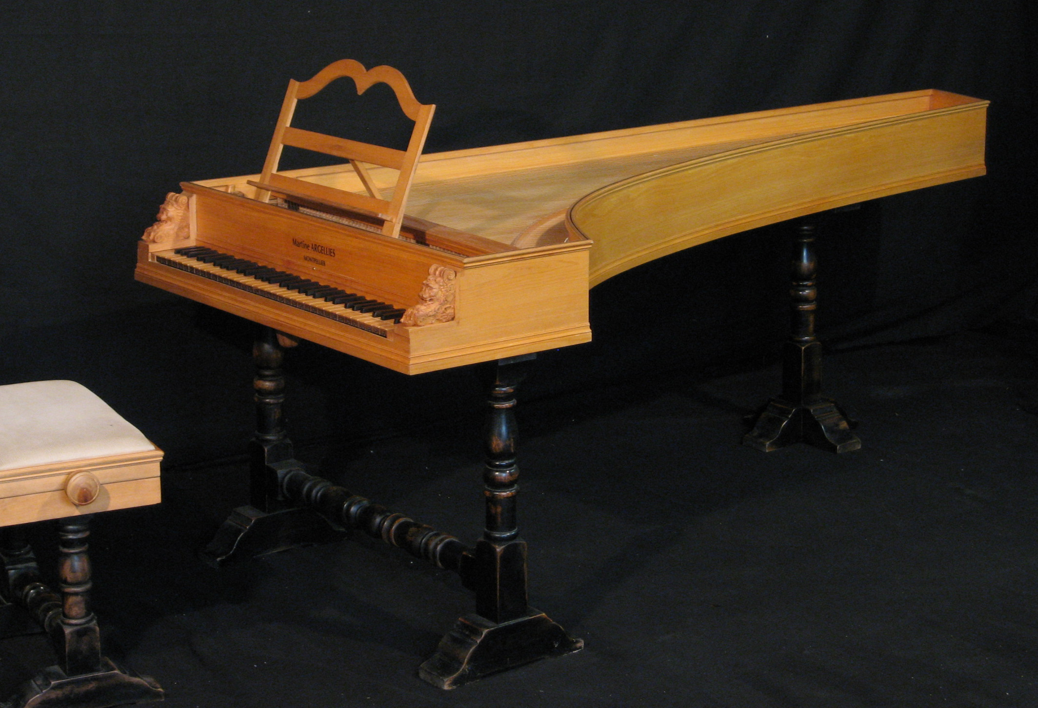 C’est un grand clavecin Italien très racé avec une éclisse courbe longue, fine et très cintrée. Il est en cyprès ciré, très épuré et somptueux.