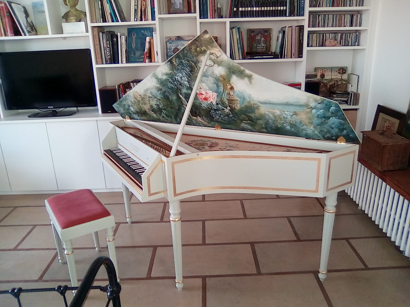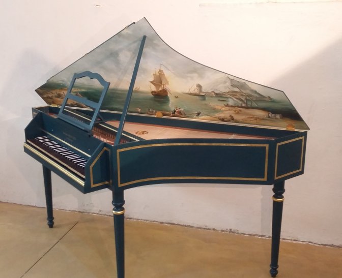 L’épinette en photo est disponible avec un surprix de 2500 € pour la marine, qui est une peinture à l’huile d’après Vernet peinte par Sandra Chadouteaud.
